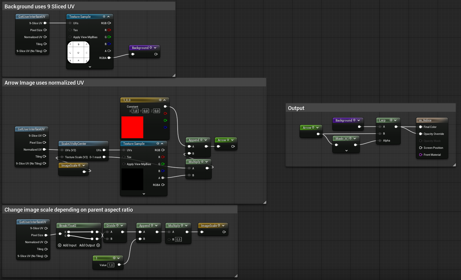 The GetUserInterfaceUV node exposes the Normalized UV and the 9-Slice UV.